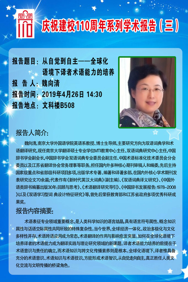庆祝建校110周年学术报告(三):从自觉到自主——全球化语境下译者术语能力的培养